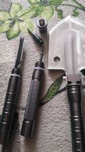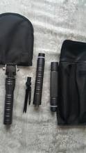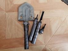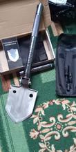 Quality camping shovel. The handle is made of metal alloy. Looks like silumin to make it easier. The blade itself is made of 3mm or 4mm steel, the steel is good, it seems to be covered. There is a sharp knife, a whistle and a Flint, a sharp tip of a hundred would beat anything